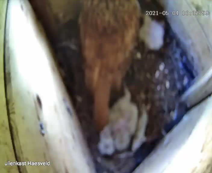 De onschuldige uitleg. Mama uil is wat overkomen. Een slag van een auto gekregen. Groggy. In een graskant gelegen. Zich moeizaam weten te redden door duizelig in een struik te klimmen. Kon de eerste dag nog niet vliegen. Nu weer wel. Met veel moeite weer naar de nestkast gevlogen. Helaas te laat: kindjes dood. Nu in rouw. In triest.