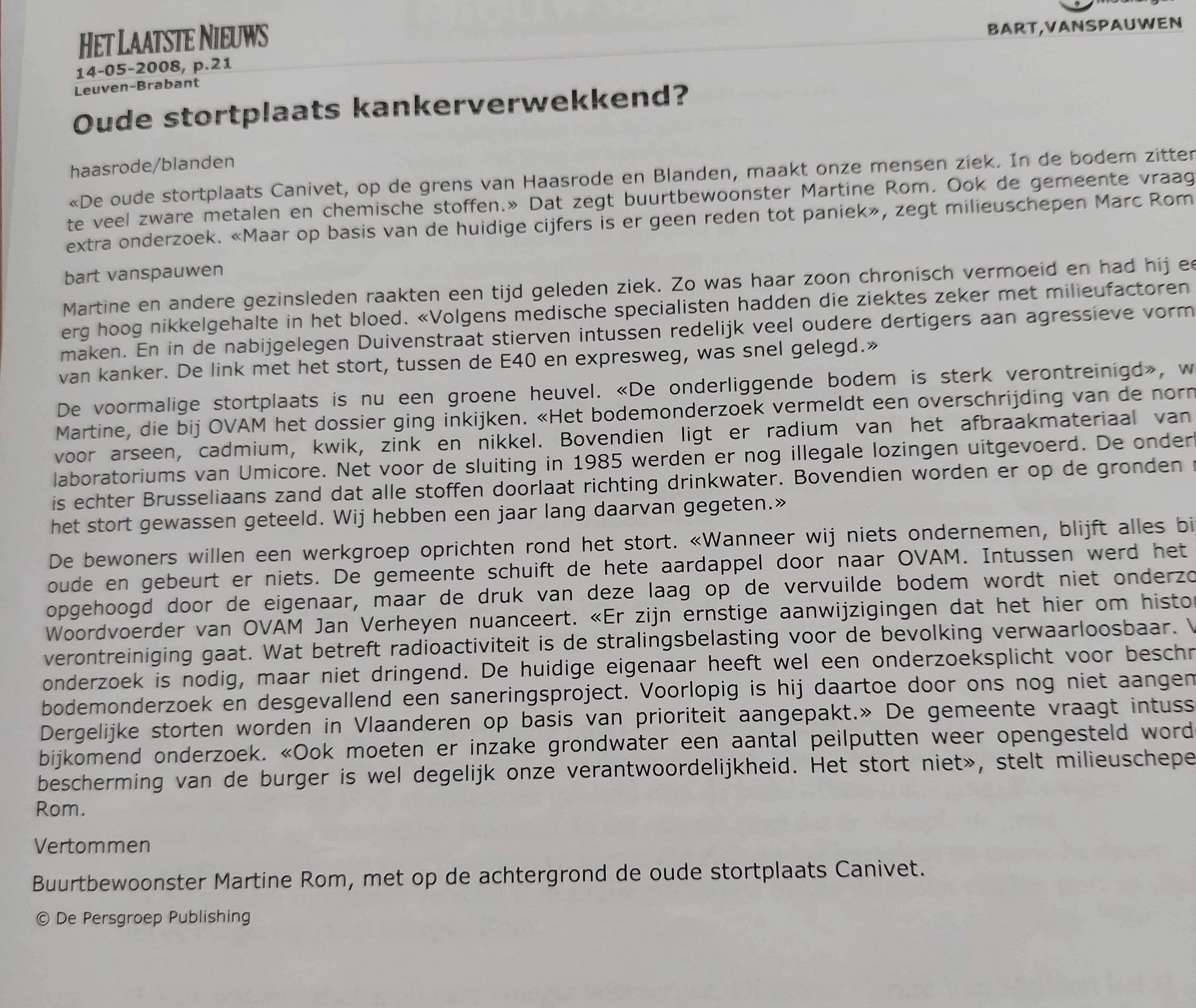 We citeren letterlijk uit het document op de website van de gemeente: De analyses op de peilbuizen tonen aan dat er zich een verontreiniging in het grondwater bevindt rondom de site ‘Canivet’. Deze kan op middellange termijn een bedreiging vormen voor een deel van de drinkwaterwinning te Heverlee ‘Abdij’. In het behandelde drinkwater van het WPC HAC wordt er momenteel geen kwaliteitsverandering opgemeten. Door de menging van het ruwe water en de behandeling in het HAC zijn er momenteel voldoende barrières aanwezig om een kwaliteitswijziging op te vangen. Indien noodzakelijk kan De Watergroep bijkomende maatregelen nemen, bv. door een deel van de winning van Abdij van het Park uit dienst te nemen. De concentraties rondom het stort lijken niet echt te evolueren in de tijd. De aanwezigheid van deze stoffen in de peilbuizen buiten het stort doet wel vermoeden dat er nog steeds uitloging plaatsvindt.(….) In de peilbuizen aan de stortplaats, op ongeveer 2 km afstand van de waterwinning, wordt