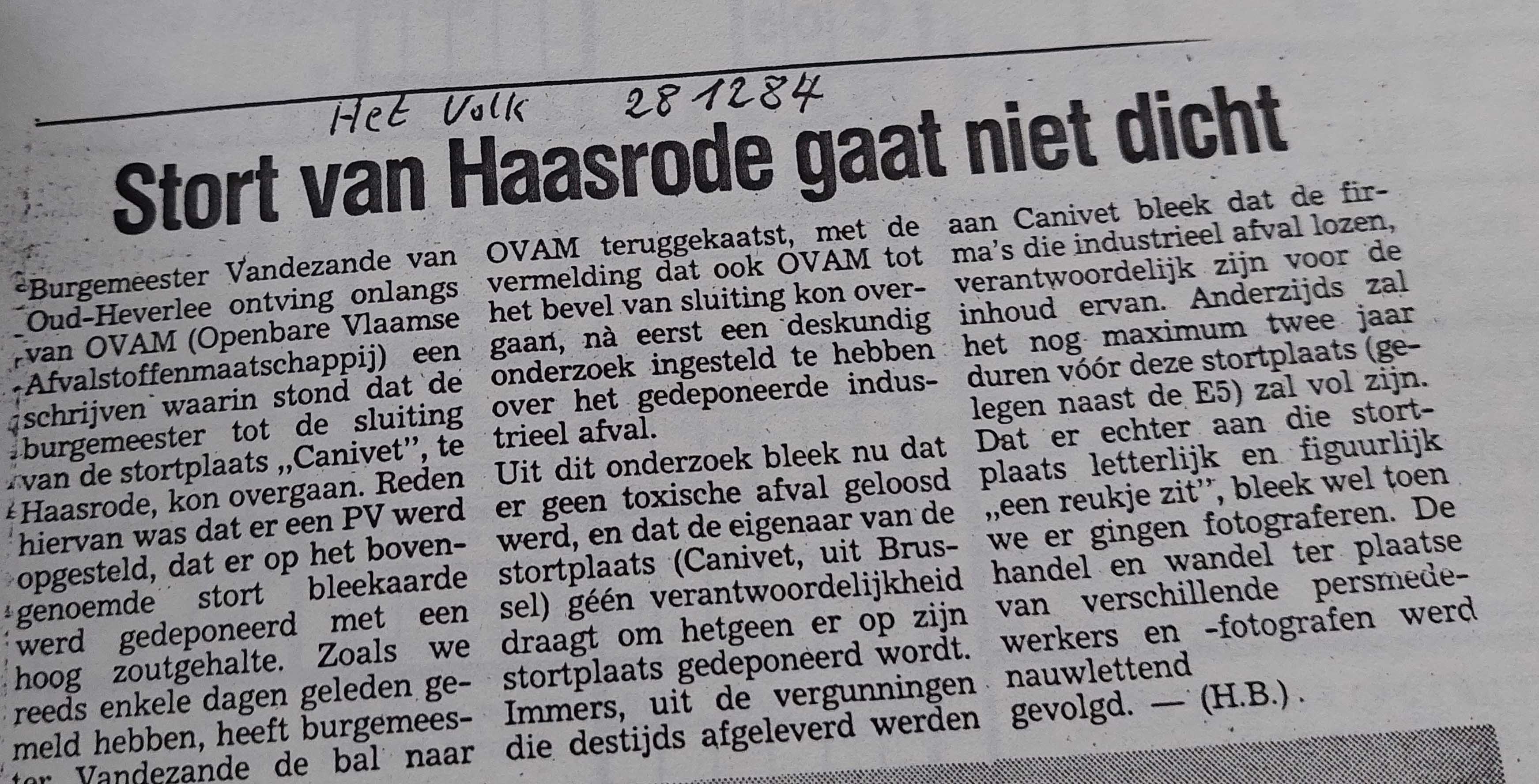 Drie archiefdozen op de gemeente vertellen de lange voorgeschiedenis met incidenten en overtredingen van de wetgeving op deze stortplaats. Begonnen in 1973 met een toelating van de toenmalige Haasroodse burgemeester burgemeester Steeno aan de firma Canivet, die ook elders in Wallonie stortplaatsen uitbaatte. En nadien een lange opeenvolging van klachten en problemen. Naast het storten van de 6000 kubieke meter licht radioactief afval, ook illegale storten van bleekaarde, niet toegelaten afval, problemen met grondwater en rioolwater, rattenplagen, stankhinder, stinkende smurrie van AB Inbev, politie vaststellingen over naburige landbouwgewassen die plots afstierven, een oude vraag van Ovam aan de toenmalige burgemeester om het stort te sluiten en de zegels te leggen na een overtreding, beroepsprocedures rond vergunningen, een oude unanieme resolutie van de gemeenteraad van Leuven om dit stort aan te pakken , etc etc.