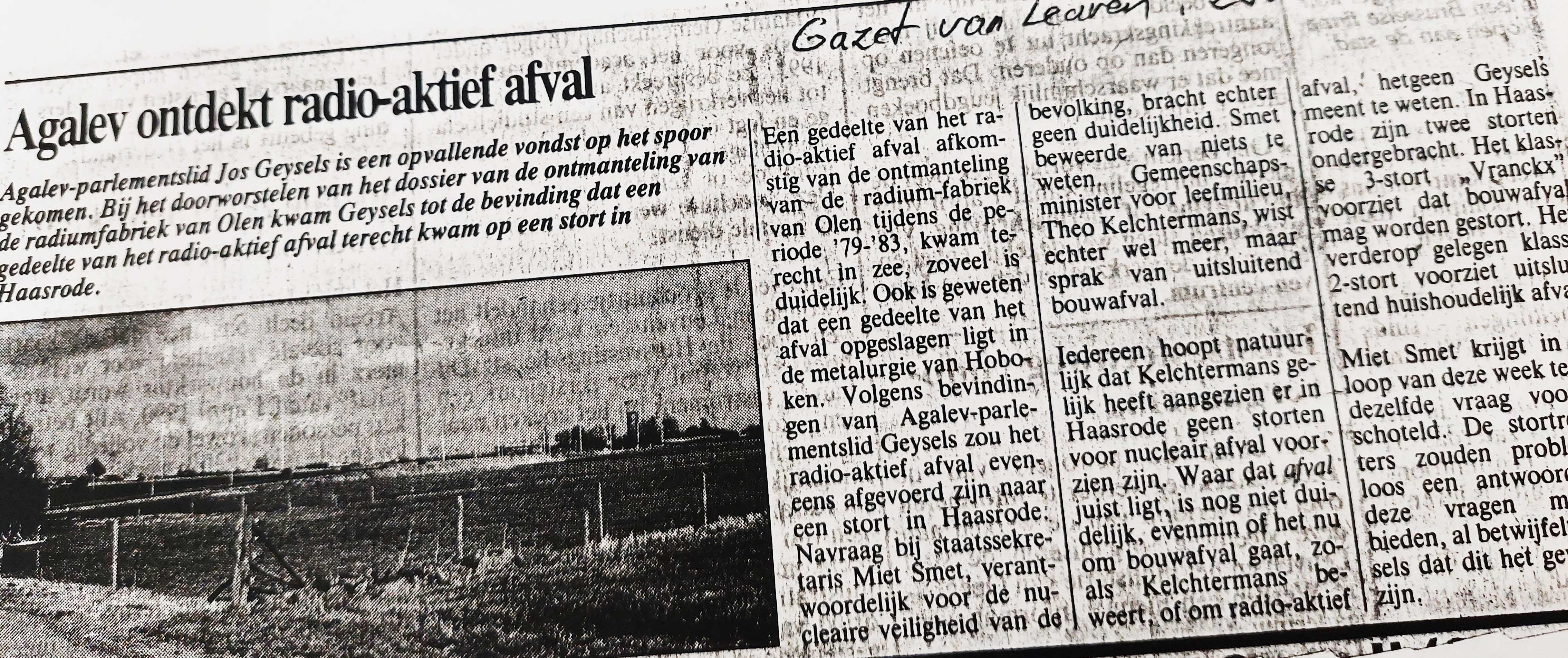 Maar keren we eerst terug naar 7 maart 1990. In de gemeenteraad van Olen bevestigen verantwoordelijken van de MHO fabriek dat een deel van de afbraakafval van hun radiumfabriek in Haasrode is terecht gekomen. Het toenmalige Agalev Kamerlid Jos Geysels ondervroeg vervolgens staatssecretaris Miet Smet en gemeenschapsminister Kelchtermans voor leefmilieu hierover: volgens Agalev hield het afval gevaren in voor de volksgezondheid. Minister Kelchtermans stuurde een brief aan het gemeentebestuur van Oud Heverlee waarin hij het storten van radioactief afval bevestigde. Die vind je hier https://drive.google.com/file/d/1Z8De8j4BIq6GBW-6rWLfCRTAh0eyG4Hw/view?usp=sharing. Volgens de minister was de radioactiviteit van het afval voorafgaandelijk gemeten door een controleorganisme, Corapro. Die oordeelden dat de radio-activiteit dermate laag was dat het storten van dit bouwafval geen risico inhield. Dat werd door Agalev betwist.