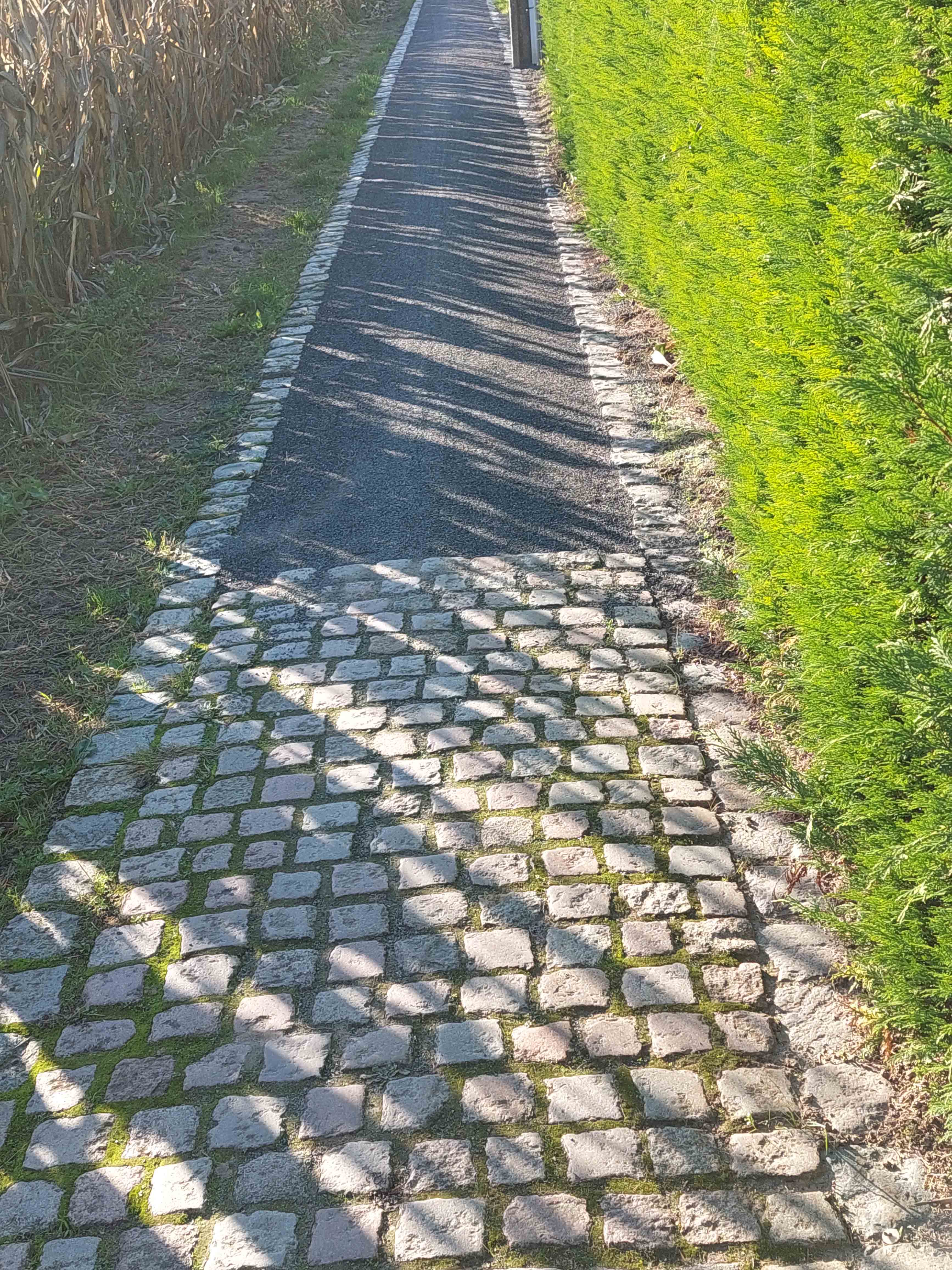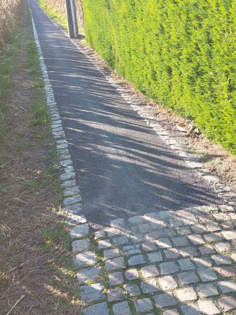 Integendeel, de kasseien van het wegje lagen slecht, en dus was al eerder gevraagd aan IGO Leuven om herstellingswerken uit te voeren. Behalve de eerste twintig meter waar de kasseiweg in goede staat was, werd over de rest van de voetweg de kassei uitgebroken, een boordrand in kassei behouden, en het rijvlak opnieuw aangelegd met “poussier”, een soort van waterdoorlatend fijngemalen gesteente om een optimaal wegdek voor voetgangers en fietsers te bekomen. Dat levert goede resultaten op, ook voor kinderkoetsen en zelfs rolwagens.