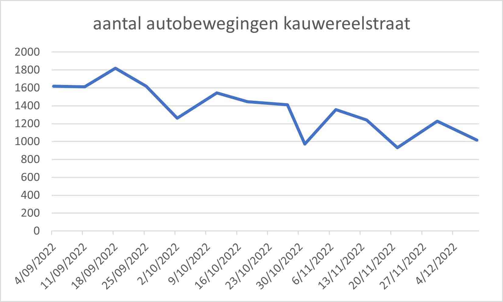 De bewoner van de Kauwereelstraat die een klacht indiende bij de gouverneur protesteerde dat de Kauwereelstraat naar zijn zeggen sinds de proefperiode héél veel extra verkeer te slikken krijgt: “2250 (?) extra auto’s, lijnbussen, zwaar vrachtverkeer. Een blik op de telcamera gegevens toont dat dit niet klopt: de verkeersdrukte steeg weliswaar de tweede helft van september om nadien trendmatig te dalen.
