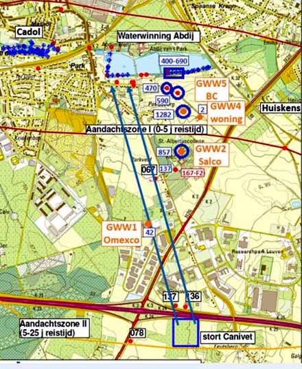 Het grondwater beweegt héél traag vanuit het stort Canivet richting Abdij van ’t Park, blauwe lijn. Aan de overkant van de E40 autosnelweg is er een “aandachtszone” uitgetekend richting Abdij van ’t Park op een reistijd van 0-5 jaar vanaf Canivet. Het water gaat onder het industrieterrein/researchpark van Leuven-Haasrode, door richting Abdij van’t Park. Er is een particuliere waterwinning in het industriegebied van het bedrijf Omexco, ook van het Sint Albertus college (SALCO) , en verderop nog twee waarbij ook een bio boerderij. In 4 van die pompputten werden heel hoge concentraties PFAS gemeten met waarden ver boven de norm van 100ng/liter. Aan de voet van de Petrusberg zelfs 1282 ng/liter, bij SALCO 857 ng/liter.