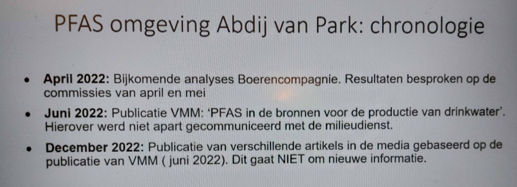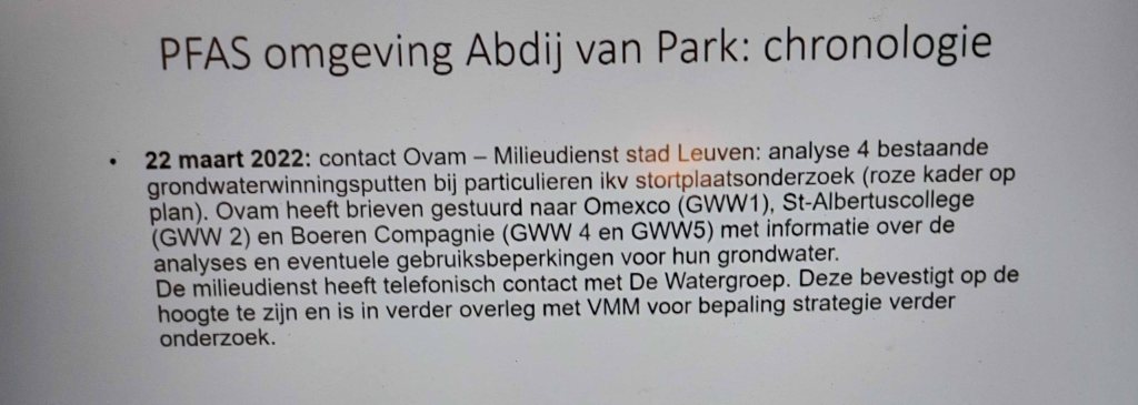 David Dessers had Mevrouw Dehantschutter van de milieudienst mee uitgenodigd. Die legde uit dat ze sinds juni 2022 waren geïnformeerd over de vastgestelde PFAS verontreiniging in de buurt van de Petrusberg. En over de zoektocht naar de mogelijk oorzaak of meerdere bronnen van verontreiniging, ook het zoeken in de richting van Canivet, waar het beschrijvend bodemonderzoek uitbleef. In alle gekende (aangegeven) particulieren waterwinningen in het gebied werden stalen genomen en op kosten van de stad Leuven geanalyseerd.