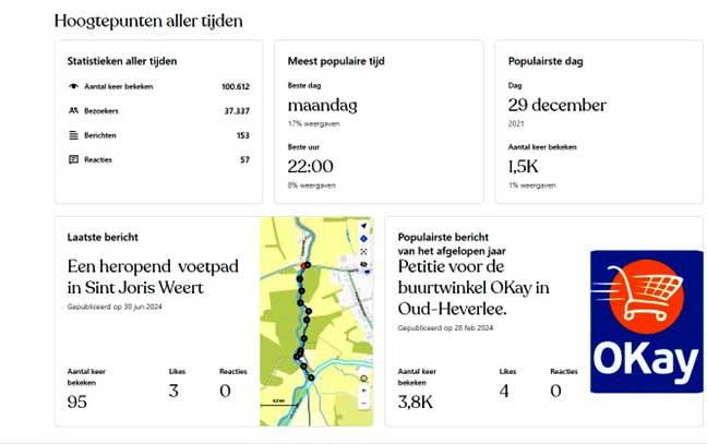 We begonnen bescheiden in 2016, met één artikel, eigenlijk louter als tegengewicht voor de lokale hetze tegen de plannen voor sociale woningen in Sint Joris Weert. Het bleef bij dat ene artikel tot we in 2018 13 nieuwe artikels online zetten. De perikelen rond de afbraak van de Clabotshoeve en de wijze waarop de Delhaize aan de vergunning geraakte voor zijn grote parking en bijhorende achterwaartse vrachtwagen-maneuvers vlak bij het schoolstraatje waren toen de aanleiding. Tegen 2020 viel dat weer stil met slechts 1 artikel , om vanaf 2021 zowat 1 artikel per maand, en sinds 2022 aan een hoger ritme stukjes te maken. De lezerscijfers volgden.