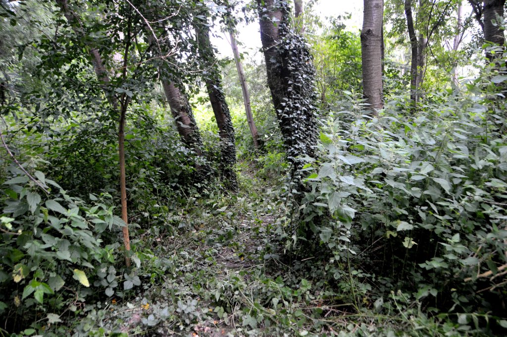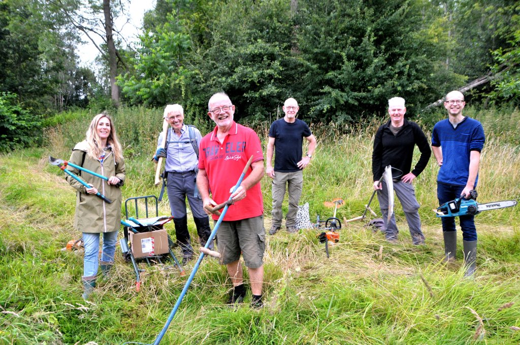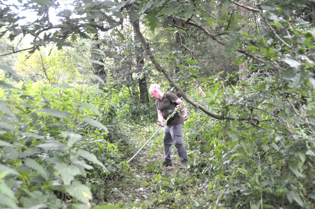 Zo lag het er ook nog bij deze zaterdagmorgen 6 juli om 10h. Maar niet lang meer. Om 10h hadden de politici van de lijst Samen afgesproken om eigenhandig de klus te klaren. Gewapend met zeisen, takkenscharen, kettingzagen, haagscharen, harken, en bosmaaiers ging een tiental vrijwilligers aan de slag.