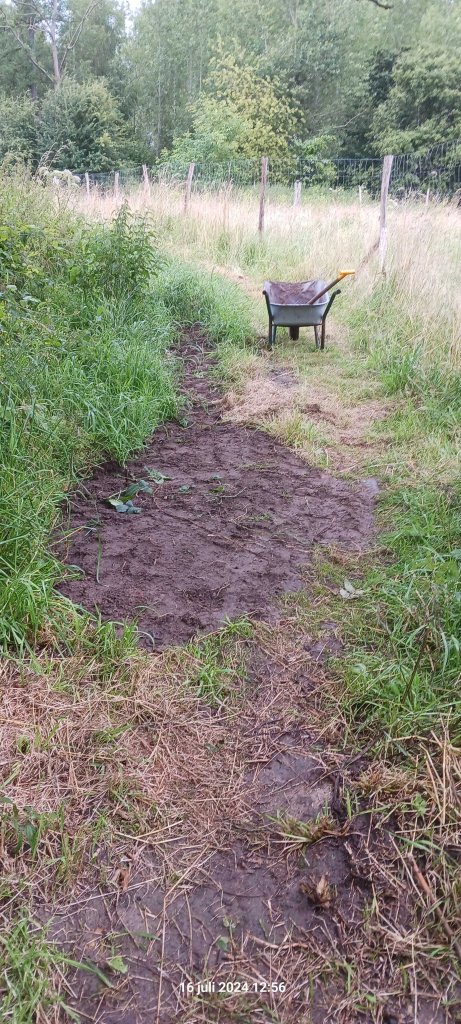 Maar vorige week werd de kers op de taart gezet. Het begin van de wandelweg, een lange brede veldweg met twee “tractorsporen” verscholen in hoog opgeschoten gras werd vakkundig gemaaid. En een “gevaarlijke” put in een van de twee sporen werd gedempt, met schop en kruiwagen. Verdienstelijk vrijwiligers werk van twee anonieme vrienden van het Dijlepad. Het wordt ei zo na een mooie wandelboulevard. Gaat dat zien.