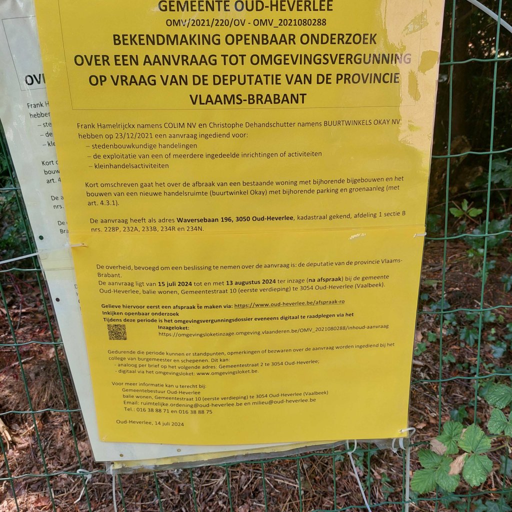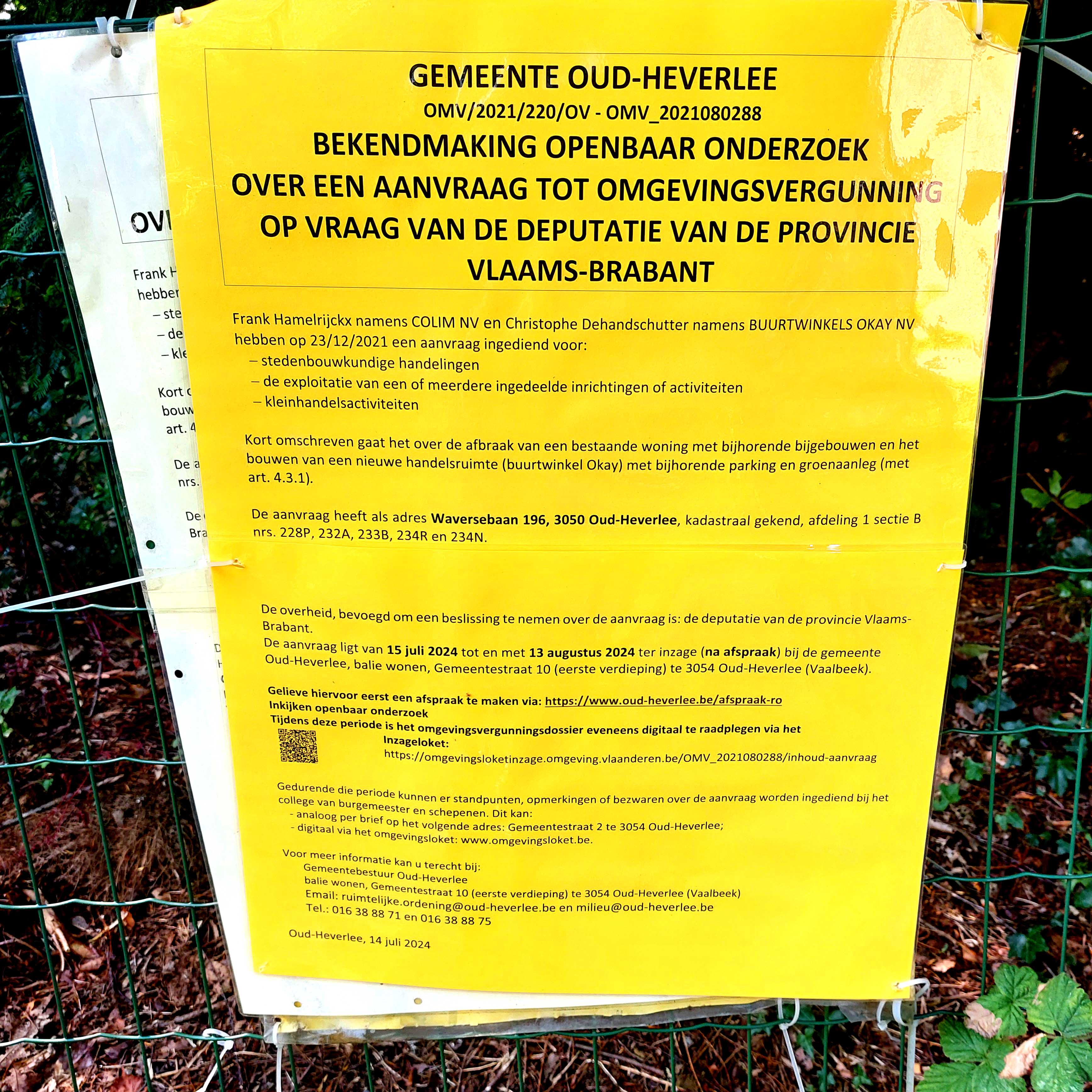 Van 15 juli tot 14 augustus 2024 loopt er voor de vierde (!!) keer een openbaar onderzoek over de mogelijke bouw van een OKAY Colruyt vestiging aan de Waversebaan. Wie dat wil kan opnieuw bezwaren indienen via de gemeente ten behoeve van de deputatie die een nieuwe beslissing moet nemen. De administratieve molen draait daarmee een nieuw rondje in de zeer trage afhandeling van de aanvraag van Colruyt om een buurtsupermarkt te bouwen.