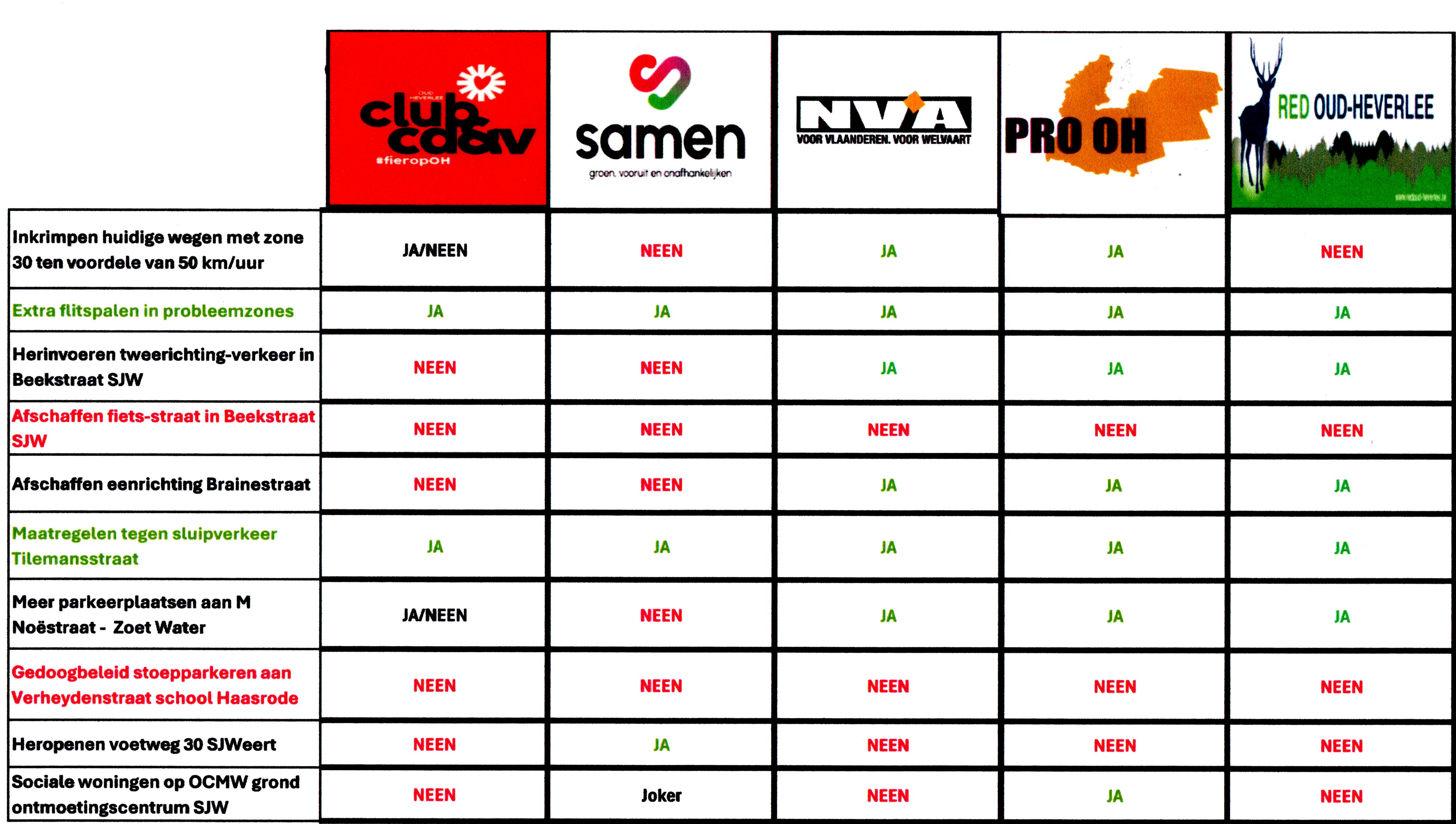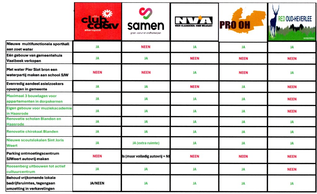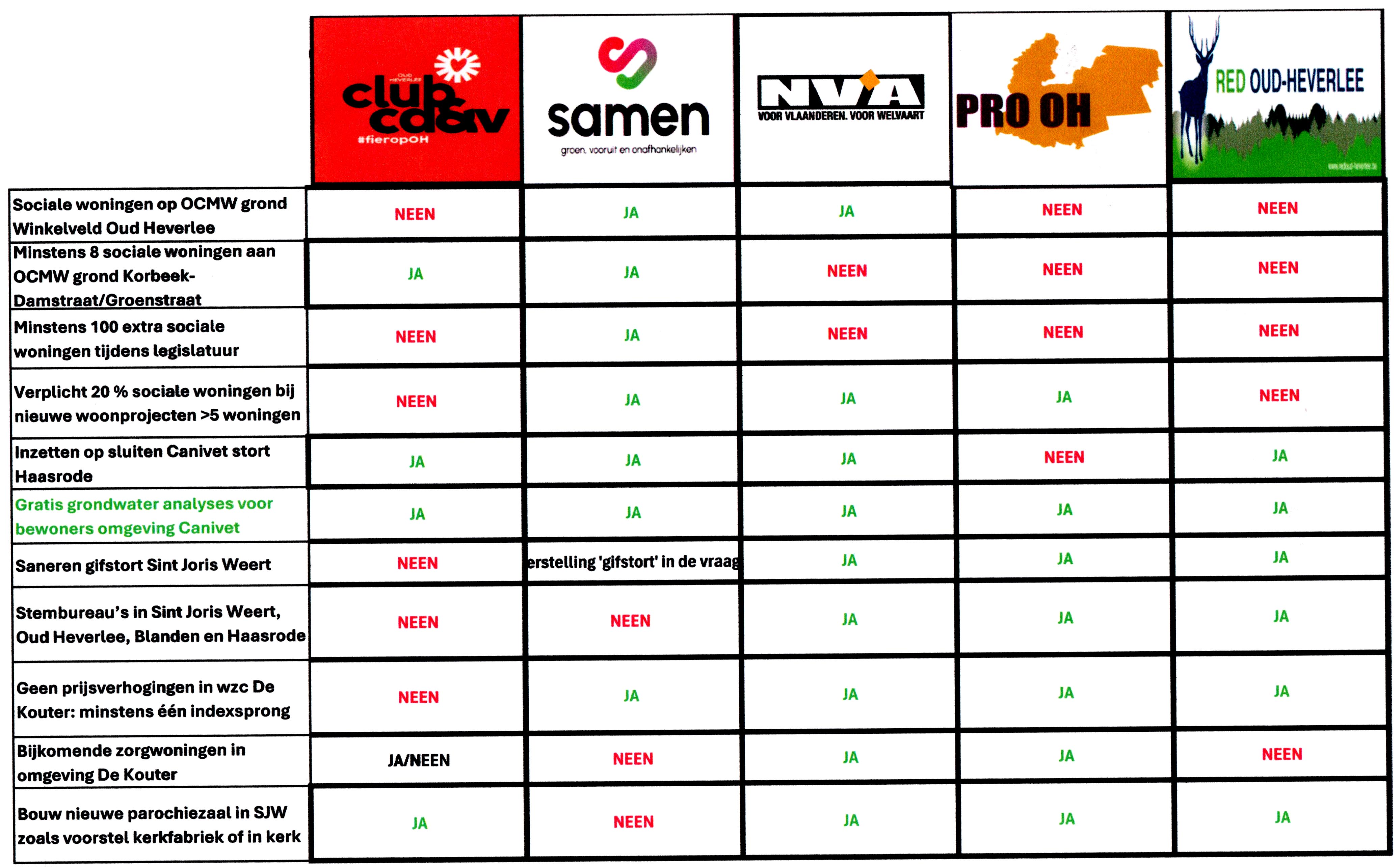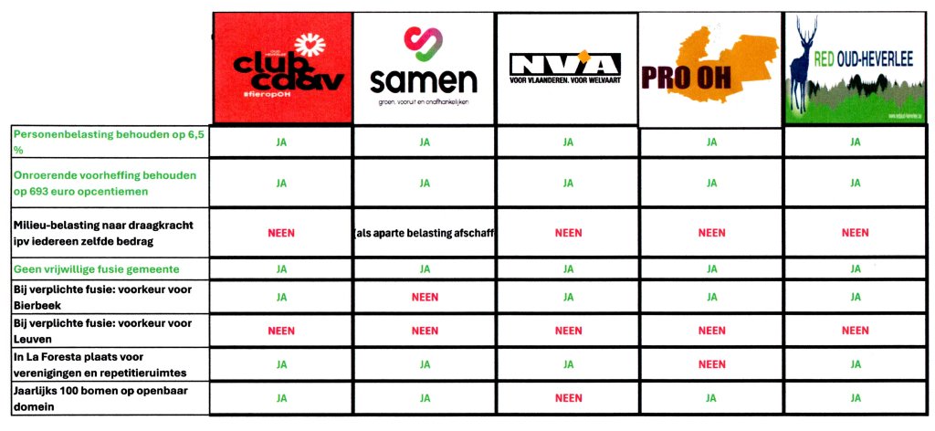 Maar leest u vooral zelf. In excel formaat vindt u alles hier in deze link naar volledige tabel . Of hieronder verknipt in 4 afbeeldingen. De toelichtingen door elke lijsttrekker bij hun antwoorden vindt u als u hier klikt : Toelichting door Club CD&V Toelichting door Samen Toelichting door N-VA Toelichting door PRO OH Toelichting door Red Oud Heverlee