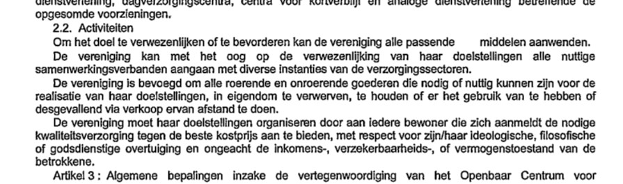 Bij de oprichting van vzw De Kouter sloot de toenmalige coalitie van Fusiebelangen en CD&V een merkwaardige deal: OCMW en gemeente gaven de grond gratis in erfpacht, stonden mee borg voor een lening van 9,5 miljoen euro …en gaven in de statuten het gehele dagelijks bestuur én de meerderheid in de raad van bestuur weg aan de commerciële partner. Dat kan niet meer veranderen tenzij de commerciële partner mee instemt. Voor prijsverhogingen moet de Algemene Vergadering instemmen, daar kan de gemeente weigeren. De statuten voorzien dat er kwaliteitszorg moet komen tegen de beste kostprijs.