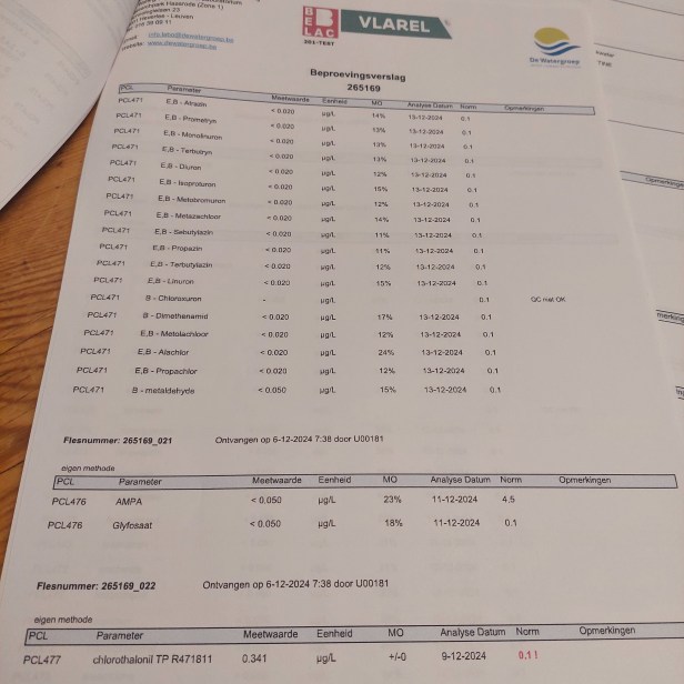 Maar meteen een geruststellende toevoeging: “aangezien deze metaboliet weinig gezondheidskundige relevantie heeft , wordt verwacht dat deze als “niet relevant” zal worden geclassificeerd. Dat betekent dat de norm van 0,1 µgram per liter hier niet langer op van toepassing zal zijn. Zolang de VMM echter nog geen officiële uitspraak heeft gedaan, hanteren wij uit voorzorg de nom voor de meest stringente situatie”.