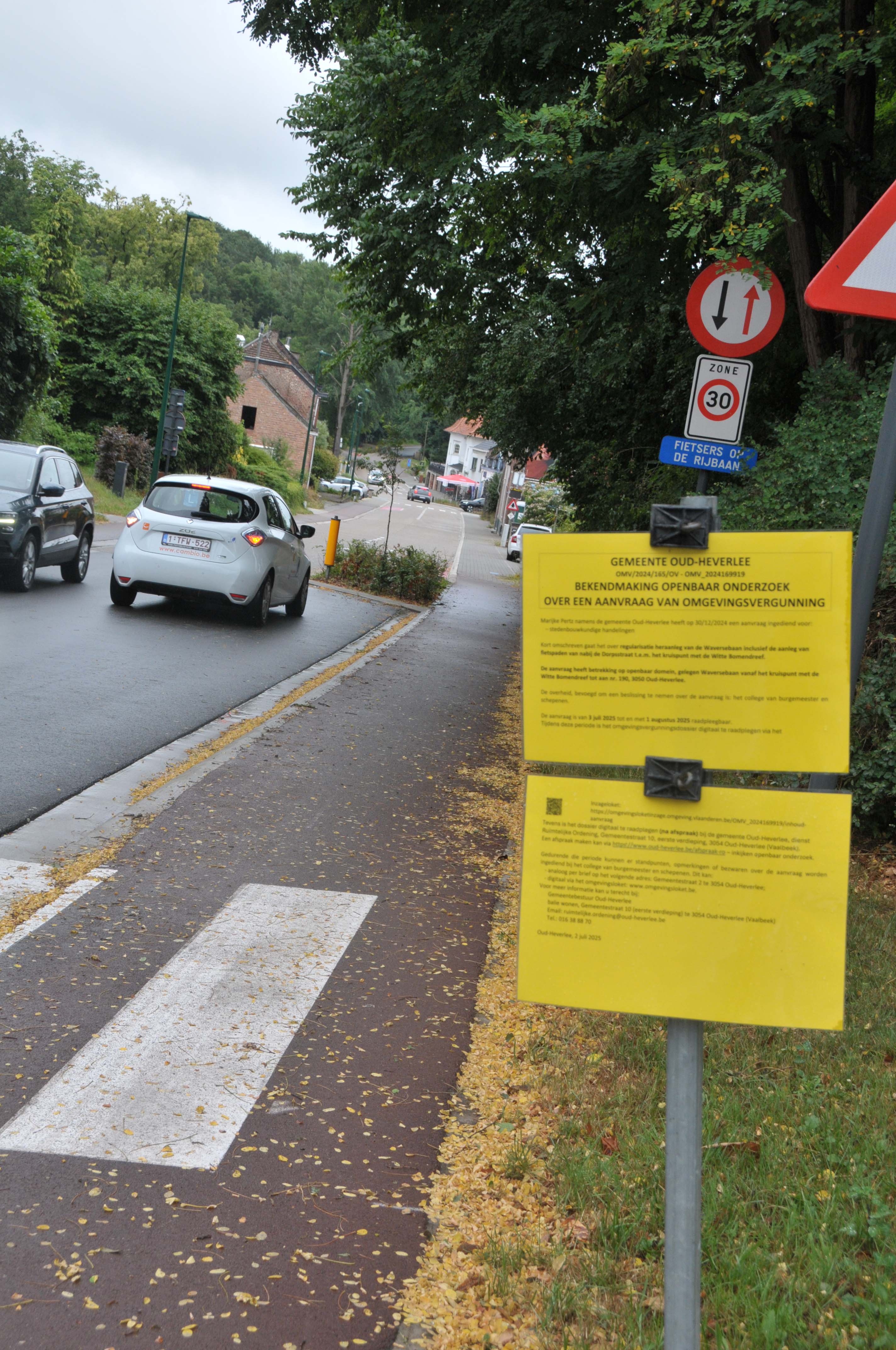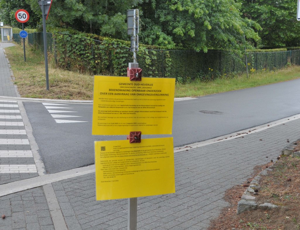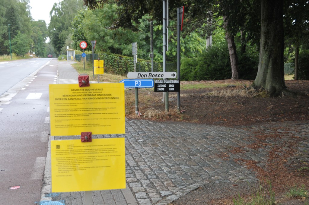 Langsheen de Waversebaan, tussen de Ruiterschool en het Zoet Water staan momenteel op liefst elf (11) plaatsen borden met de bekende gele affiches. Ze kondigen het openbaar onderzoek aan naar de nieuwste poging van de gemeente om de vergunning van de voltooide werken aan de Waversebaan terug te regulariseren.