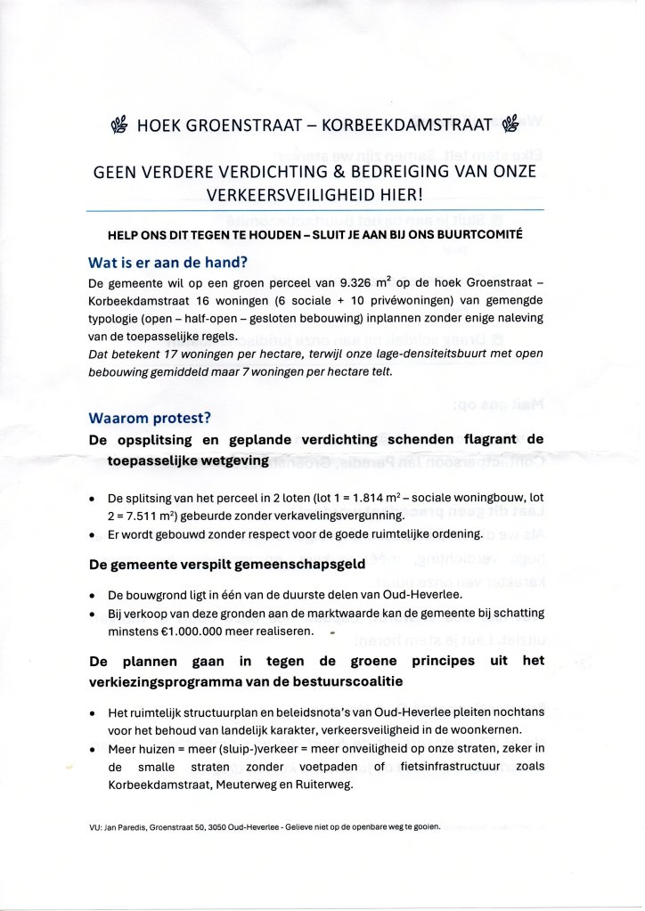 Intussen werd de situatie in Oud Heverlee nog nijpender. Het grote Durabrikbouwproject in Haasrode waar 32 sociale huurwoningen zouden komen werd afgewezen door de gemeente en in beroep ook door de provincie. Het OCMW heeft 88 are bouwgrond aan het Winkelveld, het RUP moet daar gewijzigd, er waren eerder al juridische betwistingen met omwonenden tot en met de Raad van State. Dat ligt stil. Tot vreugde van aanpalende bewoners die eerder in de pers lieten noteren dat ze daar liever konijntjes zien dan sociale woningen. Destijds kocht het OCMW 21 are bouwgrond voor sociale woningen achter het ontmoetingscentrum in Sint Joris Weert. Maar dat wordt nu een parkje, ook daar geen sociale woningen. Ook de kerkfabriek van Sint Joris Weert doet al een jarenlange surplace om zijn bouwpercelen niet voor sociale woningen te gebruiken. De sociale huurwoningen in de Boompjeswijk staan al een paar jaren leeg, te wachten op renovatie. Tja, en dan heeft de gemeente nog zelf nagenoeg 1 hectare kant en klare goed gelegen bouwgrond aan de hoek Korbeekdamstraat- Groenstraat.