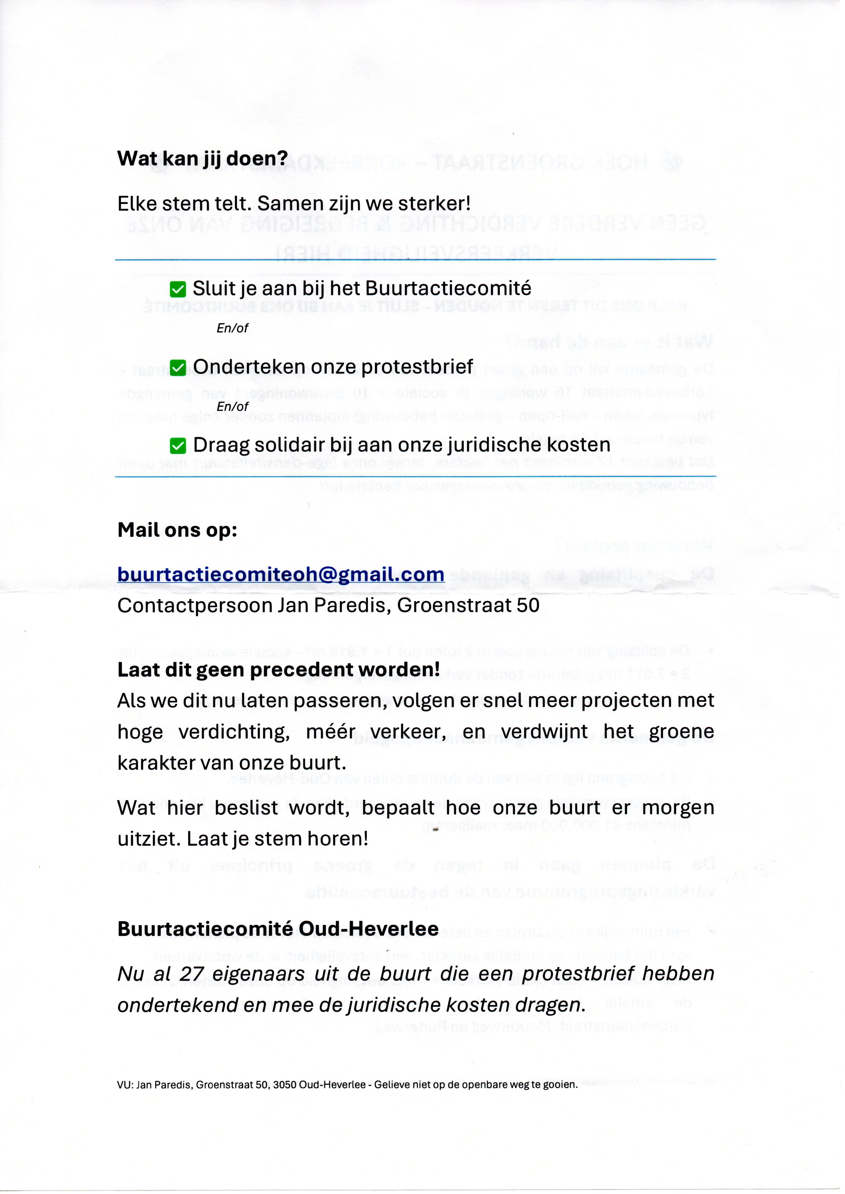 Hun actiecomité loopt niet zo vlot. Destijds waren er op 17 adressen 23 omwonenden waarvoor de advocaat zijn brief schreef. Volgens hun strooibrief zitten ze inmiddels aan 27 die de kosten van de advocaat delen. Daarom werd in de wijk een nieuwe oproep verspreid om aan te sluiten bij het buurtcomité. Om ook de nieuwe plannen van de gemeente te dwarsbomen.