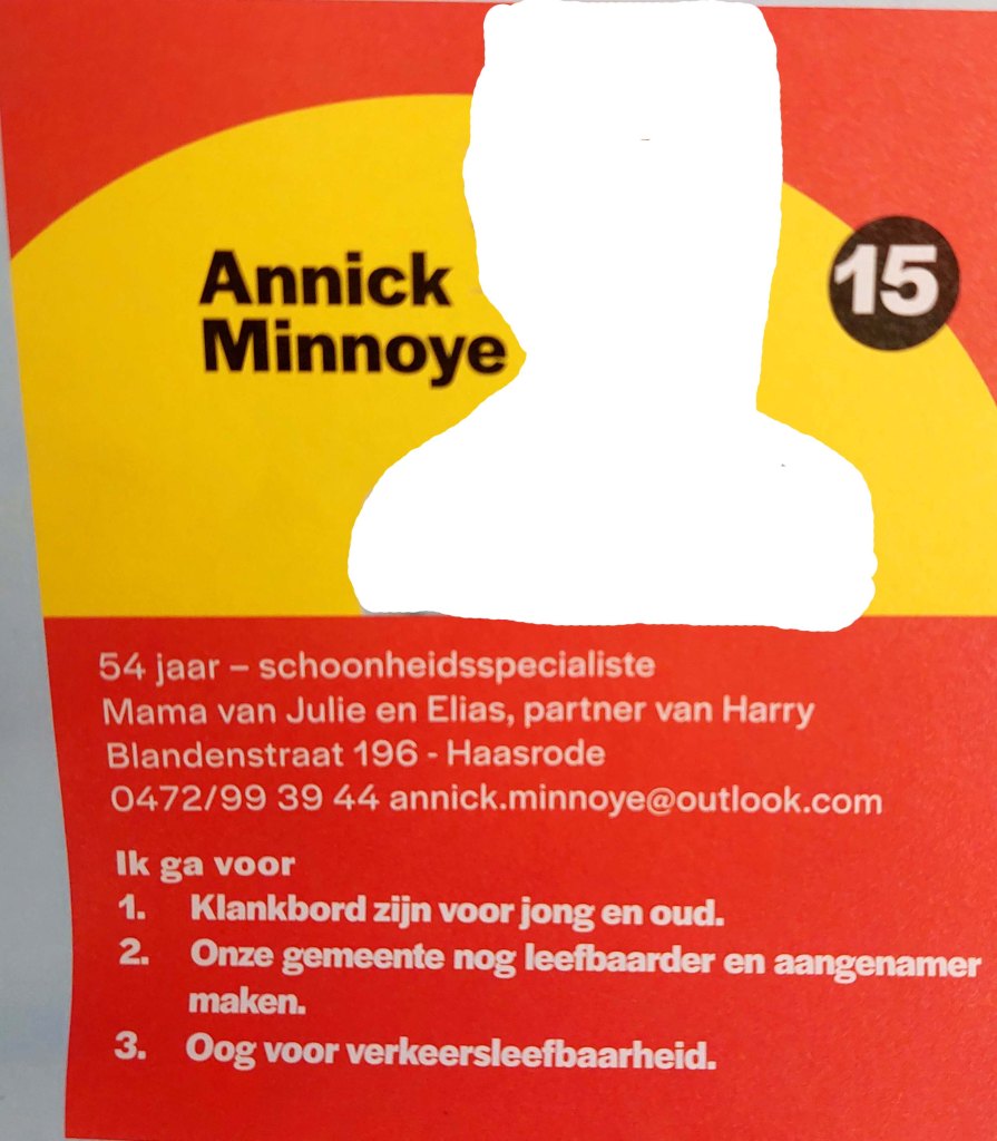 Hier stond in het oorspronkelijke artikel de foto van Annick Minnoye die we zelf namen bij haar eedaflegging. Mevrouw Minnoye vroeg ons haar foto te verwijderen “om verdere juridische problemen te voorkomen” omdat het gaat om foto’s die “jullie van mij zonder toestemming op jullie website hebben gepubliceerd”. Haar foto kan u wel nog terugvinden op https://www.clubcdenv.be/15-annick/ of bij https://www.clubcdenv.be/team/of samen met haar gsm nummer en mailadres op de site van het gemeentebestuur https://www.oud-heverlee.be/gemeenteraad-en-raad-voor-maatschappelijk-welzijn of met urenlange publieke video opnames van haar tijdens de gemeenteraad zoals deze van de vorige gemeenteraadszitting op https://www.youtube.com/watch?v=NLldFEb1HHg waar ze links voooraan zit op de oppositiebanken. Maar niet meer hier. “Kwestie van privacy niet meer te schenden”