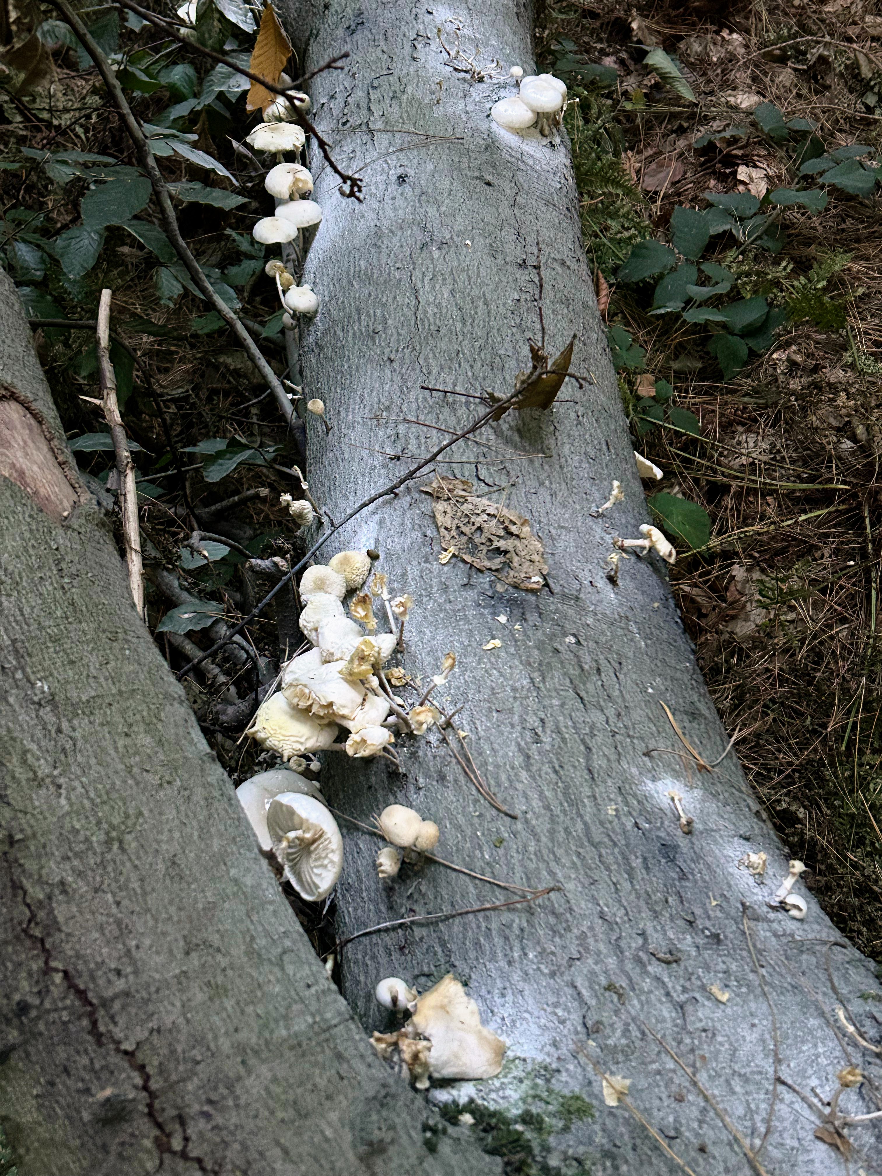| Ik kwam dit paddenstoelentafereel tegen in het Meerdaalwoud: een boomstronk bedekt met porseleinzwammetjes. En het leek alsof er een laagje poedersuiker overheen was gestrooid. Dat witte laagje zijn de sporen van de zwam. Normaal zijn die nauwelijks zichtbaar, want porseleinzwammen verspreiden hun sporen via waterdruppels – een proces dat ballistospore dispersie heet. De sporen worden letterlijk weggeschoten door een druppeltje of een kleine vochtexplosie. Door de aanhoudende droogte is er te weinig vocht in het bos om de sporen op deze manier te verspreiden. Daardoor hopen ze zich nu op dicht bij de paddenstoel zelf. Foto rechts: Porseleinzwammen © Anneke Krols |