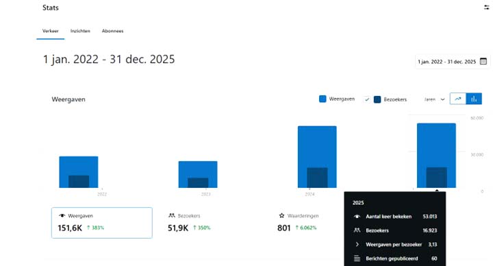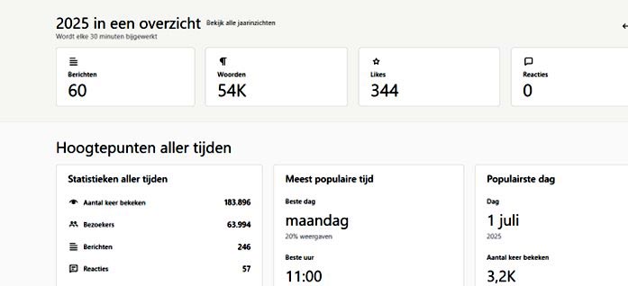 Dit electronisch dorpskrantje of blog is in 2025 weer gegroeid. 53 069 pageviews door 16923 bezoekers en daarbovenop 296 abonnees die bij elk artikel een automatisch mailtje krijgen met daarin het artikel. Die abonnees zitten niet eens in de pageviews die WordPress registreerde.