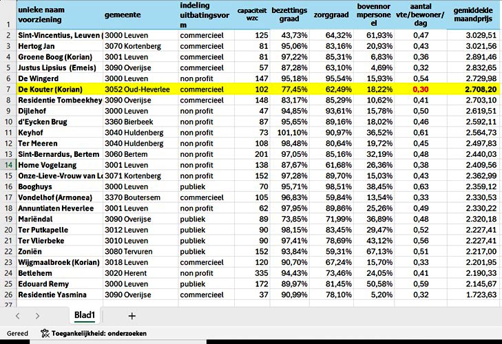Meermaals per jaar vraagt OKRA Belangenbehartiging bij de Vlaamse administratie alle officiële gegevens op van alle Vlaamse woonzorgcentra: prijzen, personeelsbezetting, aantal bewoners, aantal kamers, aantal bewoners. De woonzorgcentra moeten zelf die gegevens aanleveren aan de overheid. Met die gegevens kan je heel overzichtelijk een vergelijking maken van de kwaliteiten van woonzorgcentrum De Kouter met de woonzorgcentra in de buurt.