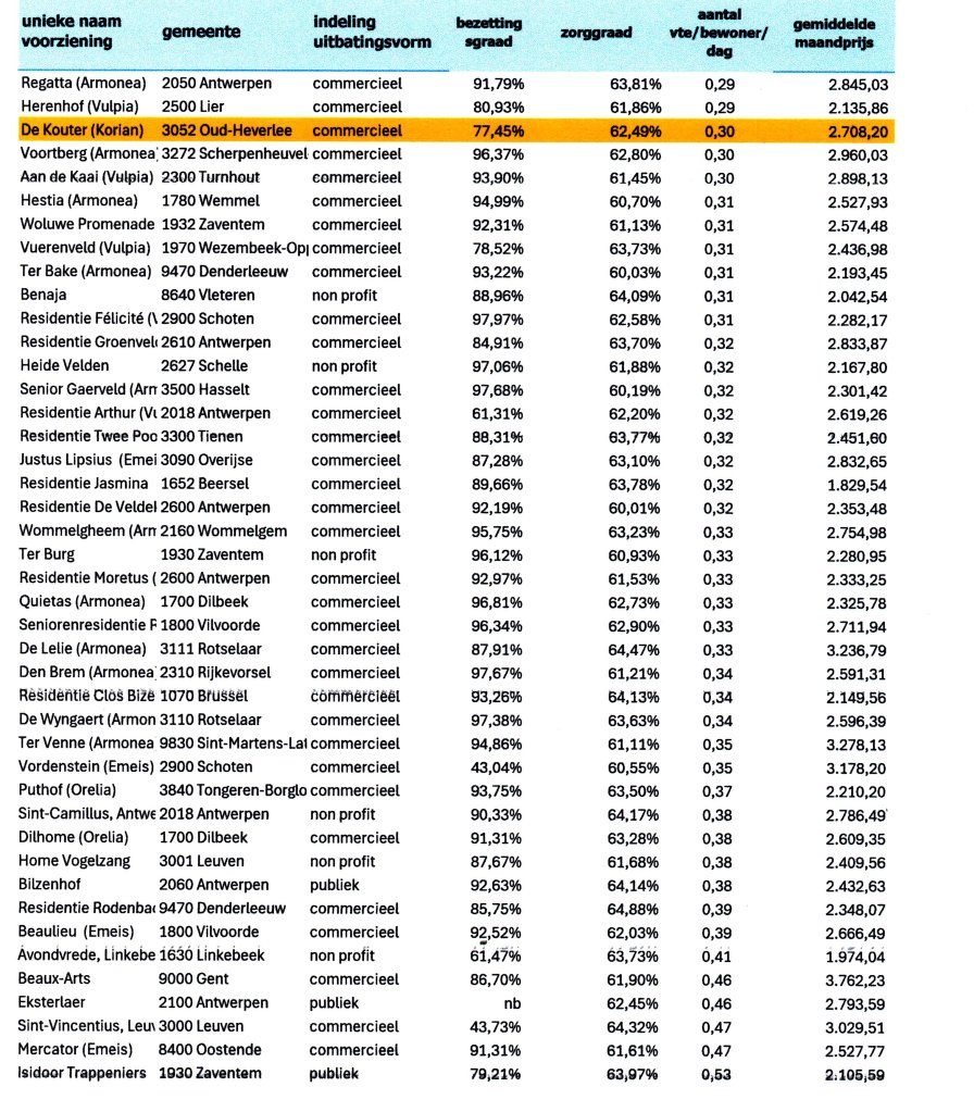 Het klopt geheel niet dat de personeelsbezetting per bewoner van De Kouter overeenstemt met woonzorgcentra die een vergelijkbare zorggraad hebben van hun bewoners. Dat kan blijken uit onderstaande tabel: er zijn 43 Vlaamse woonzorgcentra die net als De Kouter een zorggraad hebben tussen de 60 en 65 %. Of met andere woorden waar 35 à 40 % van de bewoners zelfstandig kan opstaan, zich wassen, kleden, naar het toilet gaan, eten, zich verplaatsen, en evenmin dementieproblemen heeft.