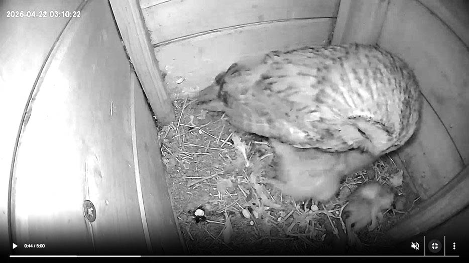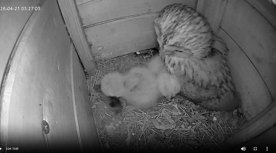 Papa heeft dode muis gebracht. Dan volgt meteen de moeilijke opdracht: zo een muis in zijn geheel doorslikken en terwijl je hongerige broer of zus afhouden. En dat allemaal terwijl je zelf nauwelijks een grotere omvang hebt dan pakweg drie dode muizen.Precies 15 dagen na de geboorte ziet het uilenjong er nog uit als een donzig kuikentje Maar als het jong zich even later uitrekt naast de mama zie je al meteen hoe snel ze groot worden. Na amper 15 dagen . Af en toe staan ook verse eekhoornjongen op het menu: hier wordt er net een opgediend. De een zijn brood, is de ander zijn dood.Heel soms komt papa kort op kraambezoek en zelf even in de nestkast zitten: gezellig met zijn vieren Een eekhoorn jong in zijn geheel inslikken : dat lukte niet meteen bij gebrek aan bestek. Mama moest wat later helpen om de kost te verdelen. Niet steeds geschikt voor gevoelige kijkers.